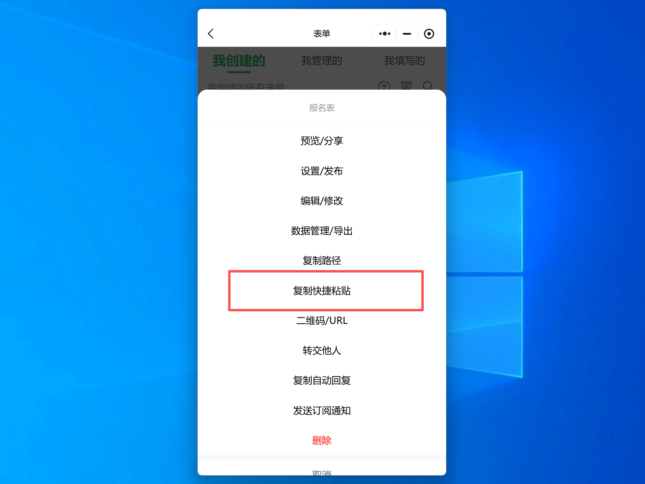 点击我的表单列表中的对应表单,点击“复制快捷粘贴”,进入复制