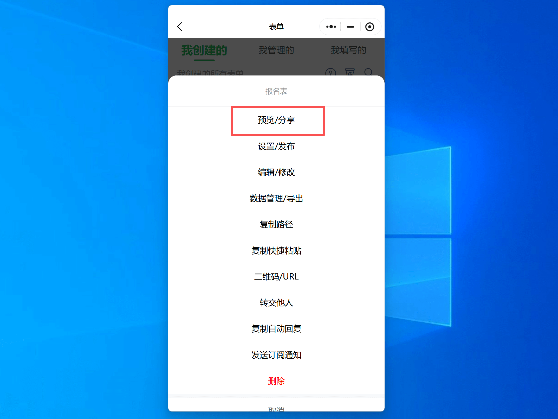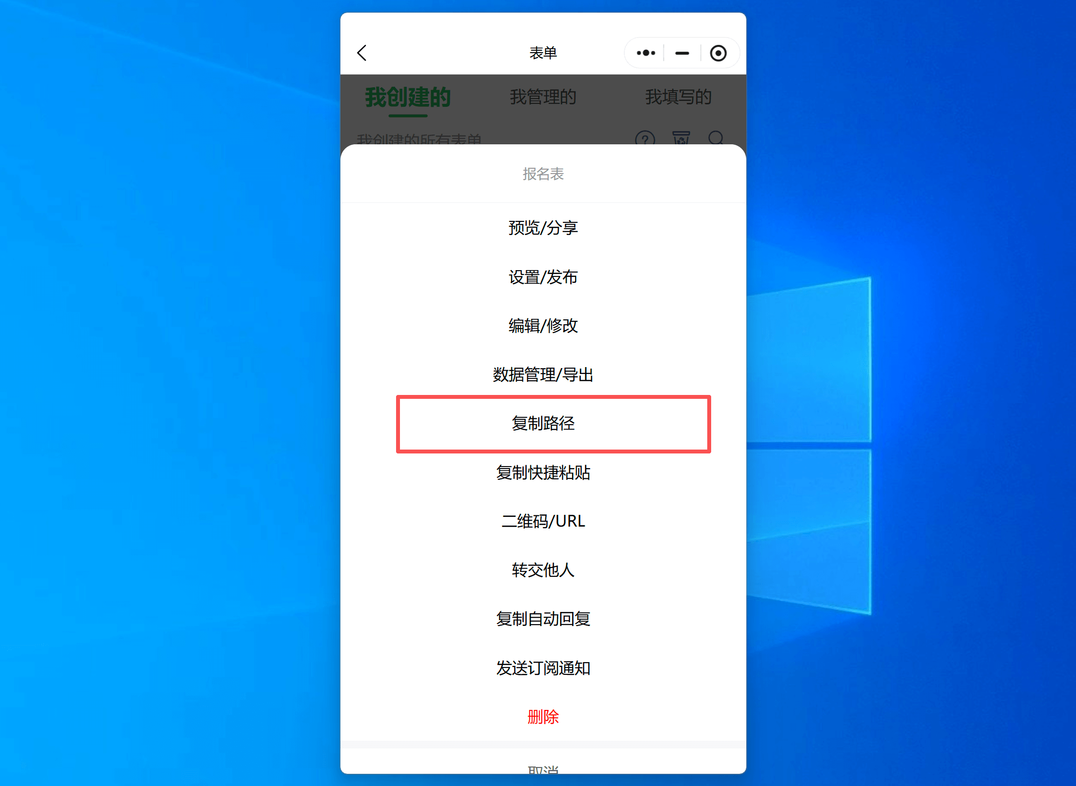 打开小正方助手,创建并发布表单/问卷,点击列表表单“复制路径”
