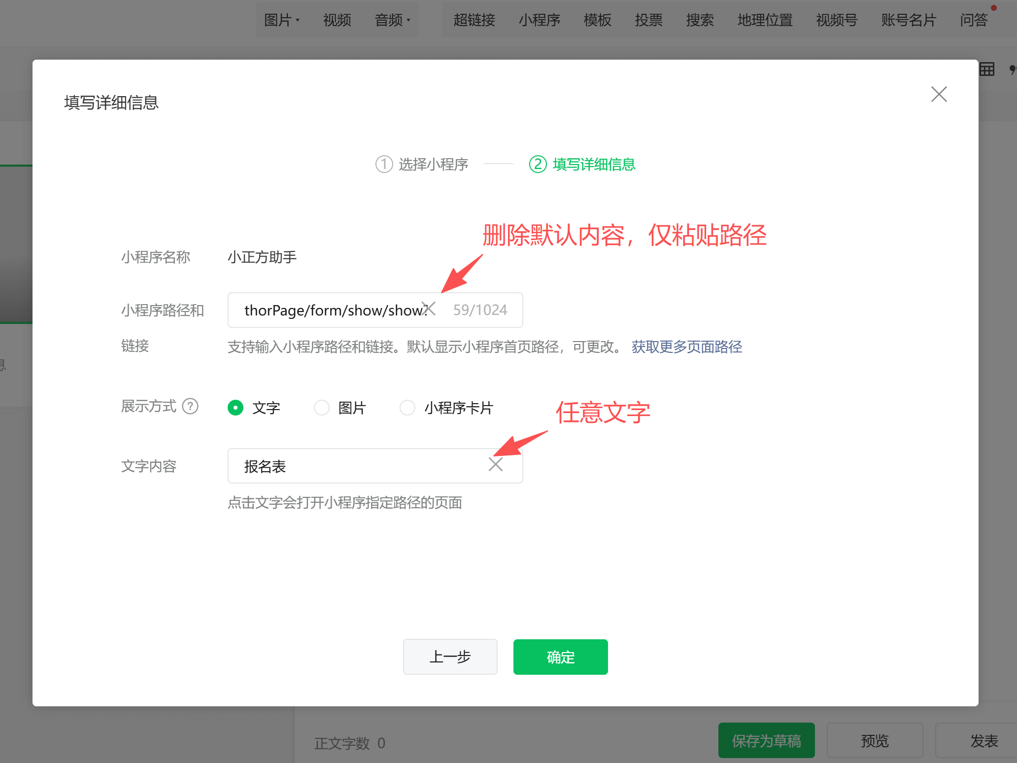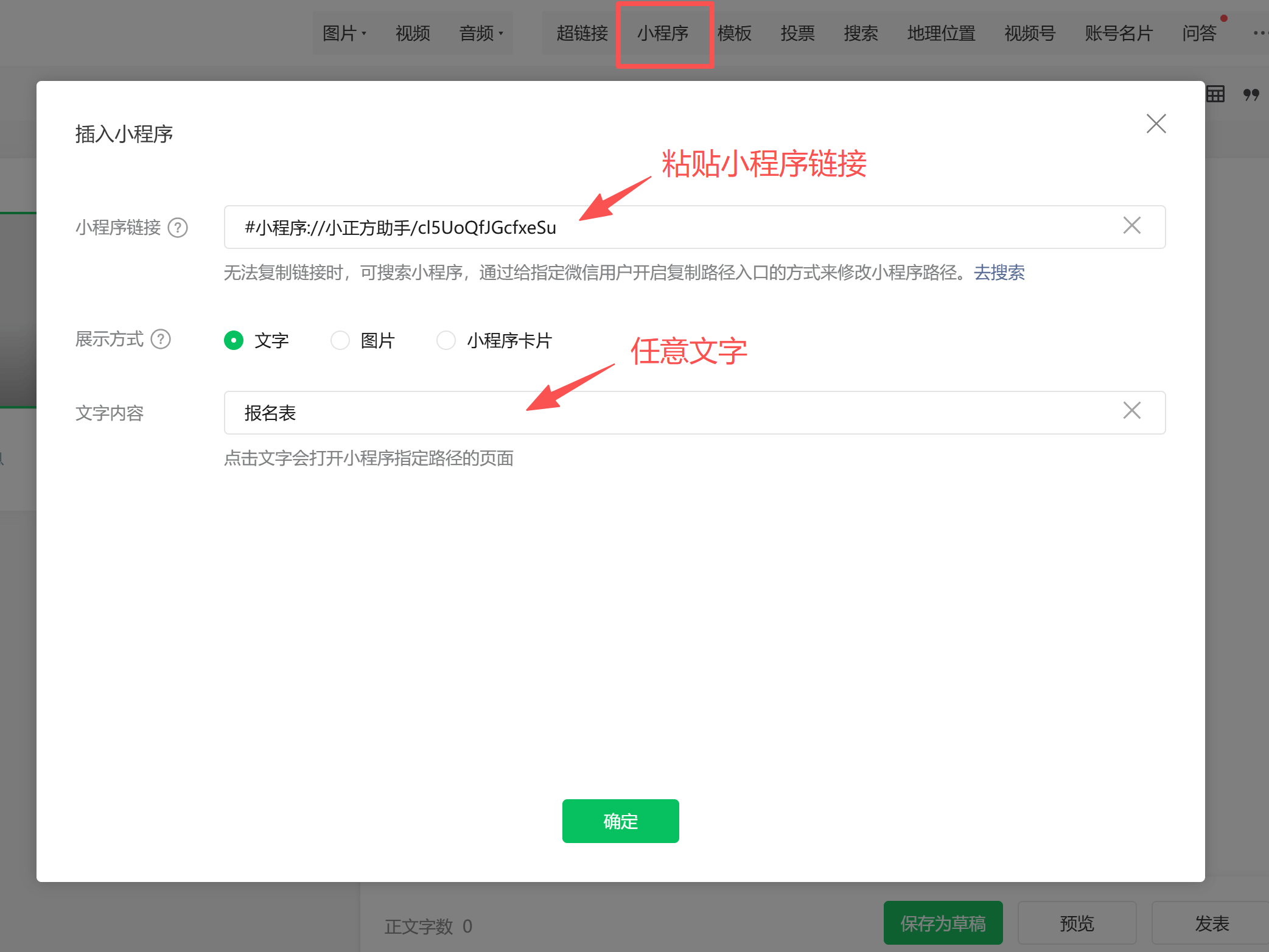 回到文章编辑器,点击“小程序”按钮,粘贴小程序链接,输入表单名