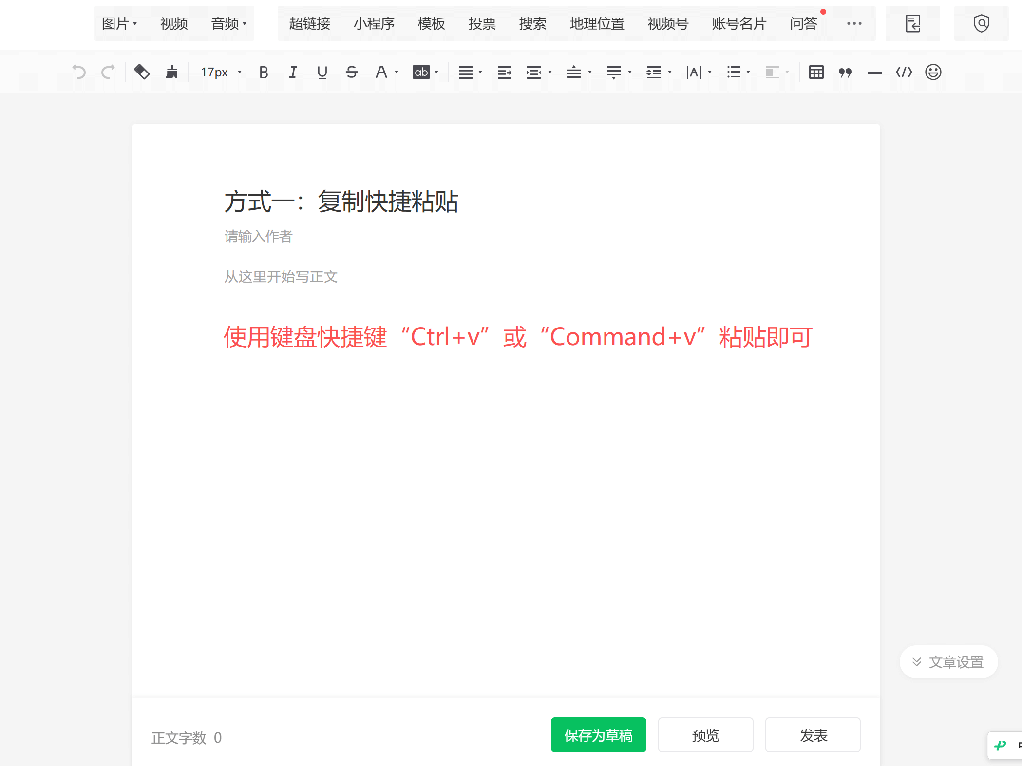 回到文章编辑器中,使用键盘快捷键“Ctrl+v”或“Command+v”粘贴