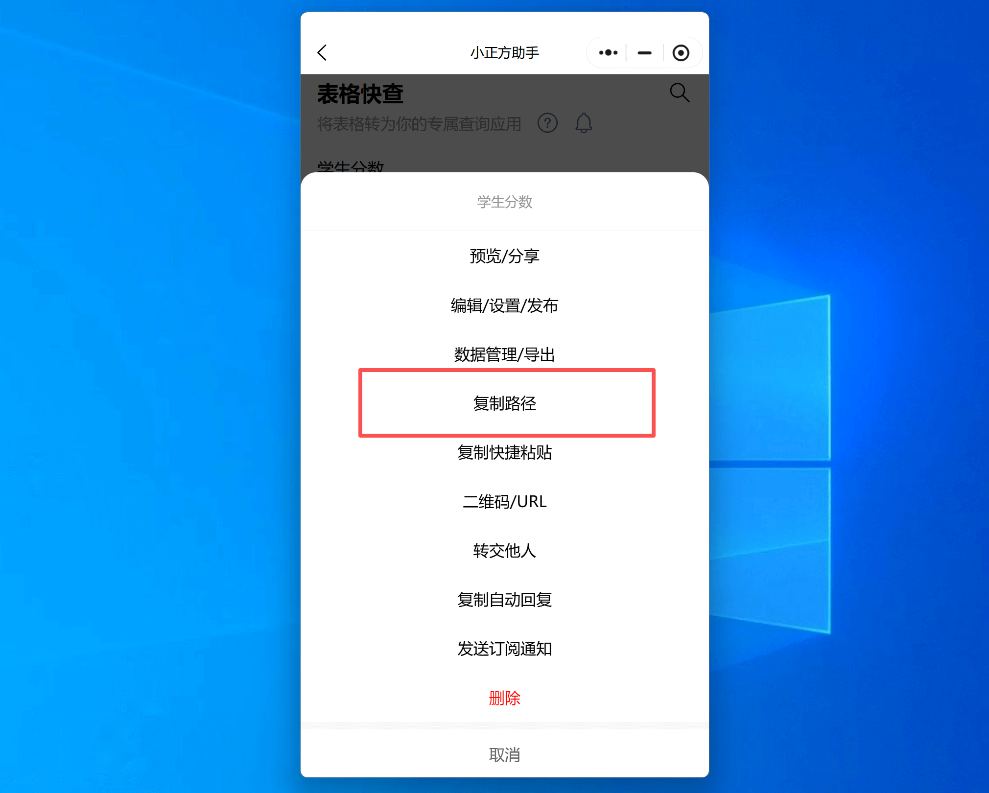 打开小正方助手,创建并发布表格快查,点击列表快查“复制路径”