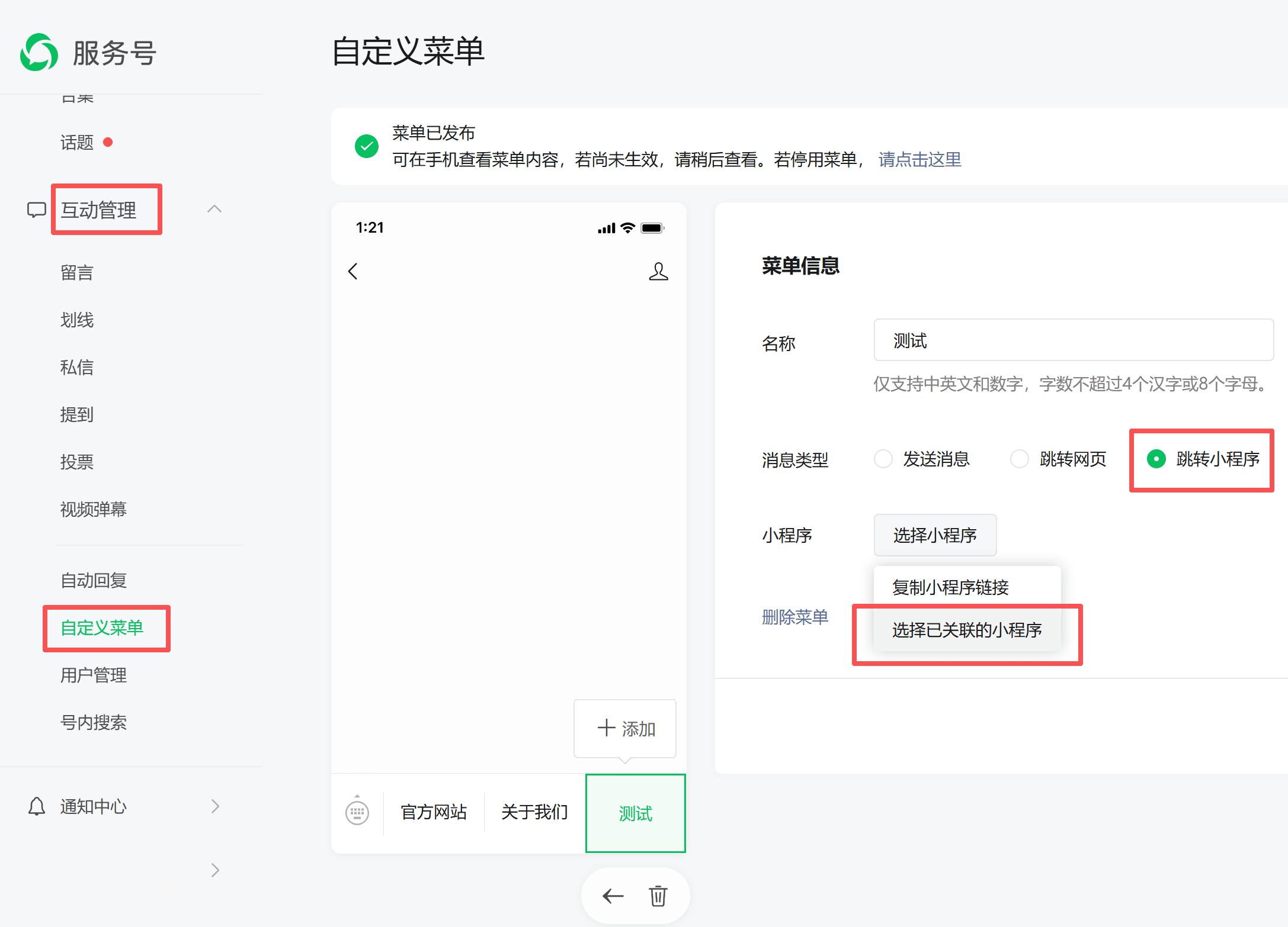 回到公众平台添加菜单,类型选择跳转小程序,然后选择已关联的小程序