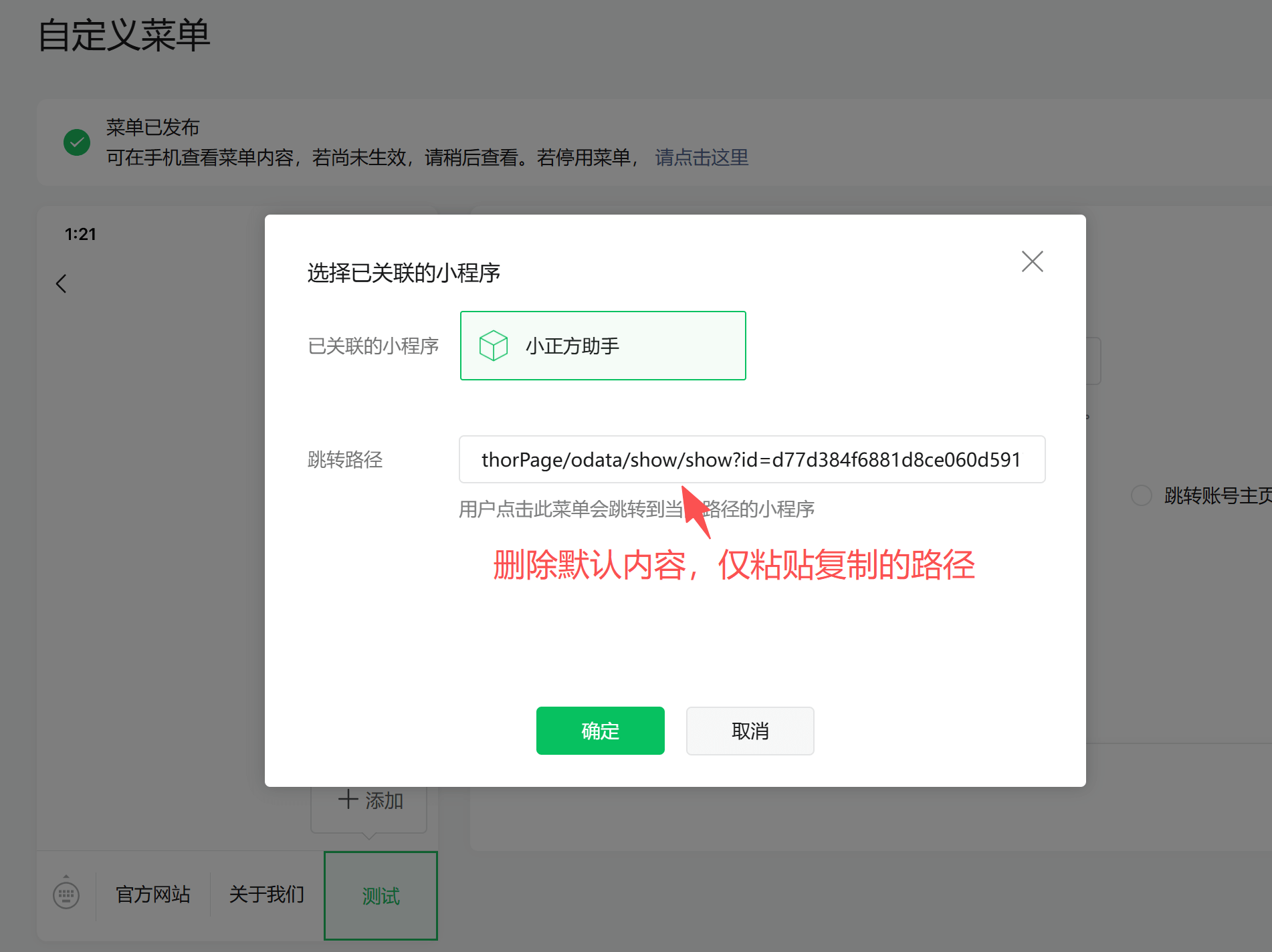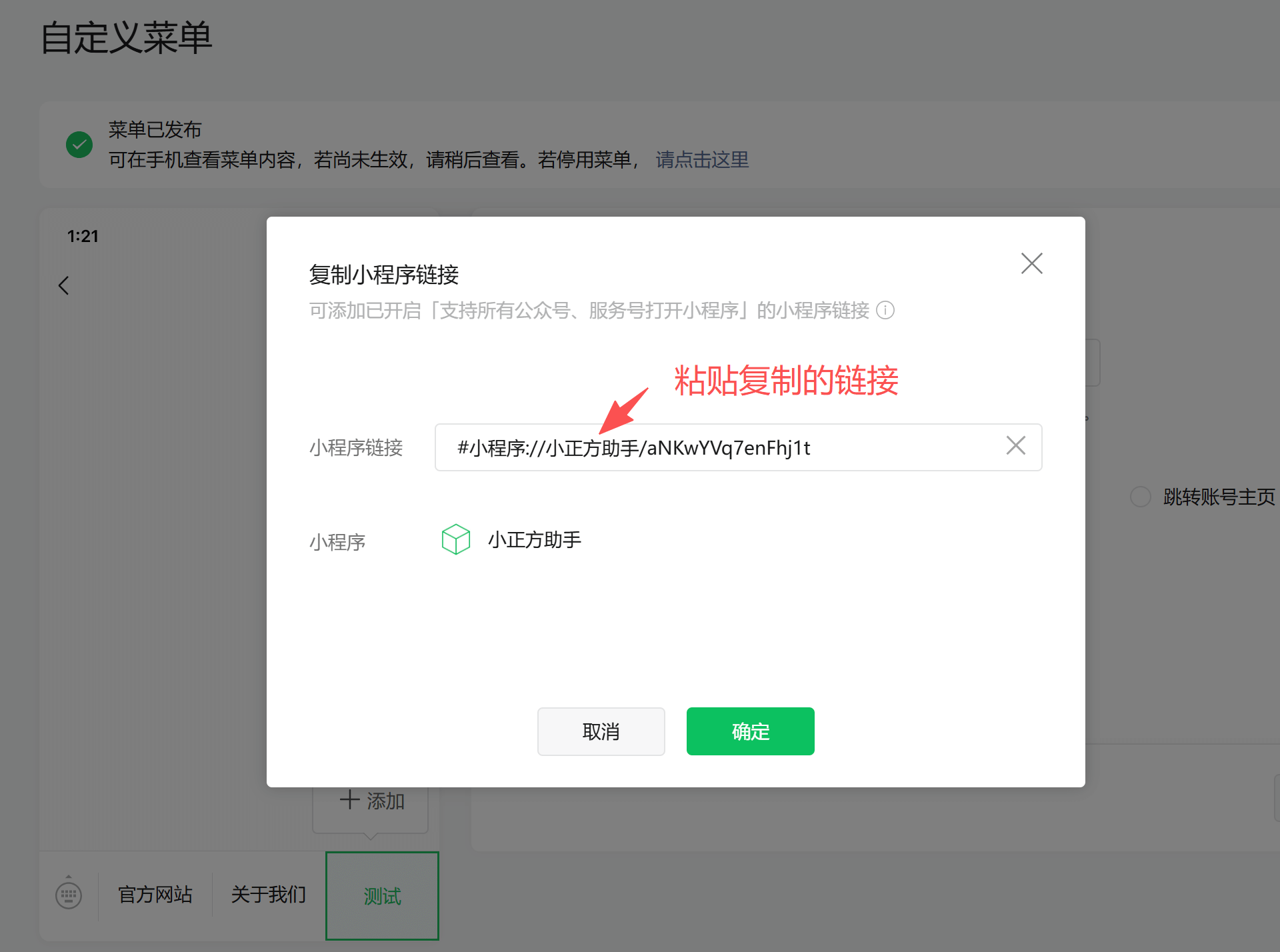在弹出的对话框中,粘贴小程序链接,确定后预览无误,最后再发布菜单