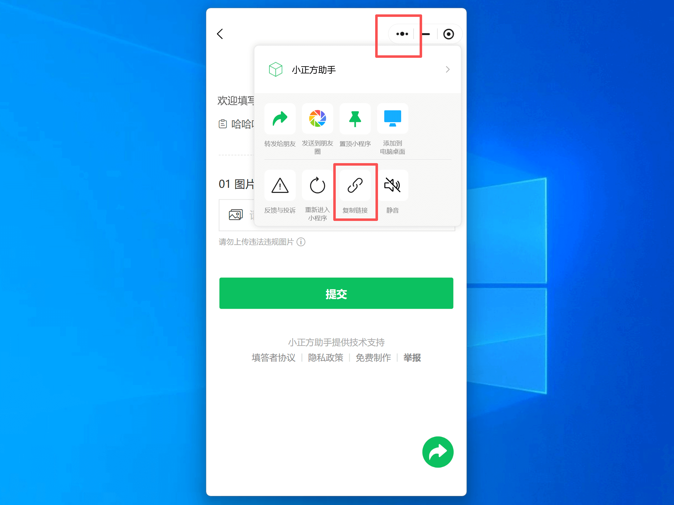 创建发布后,进入表单详情页点击页面右上角的“...”,点击弹出菜单中的“复制链接”