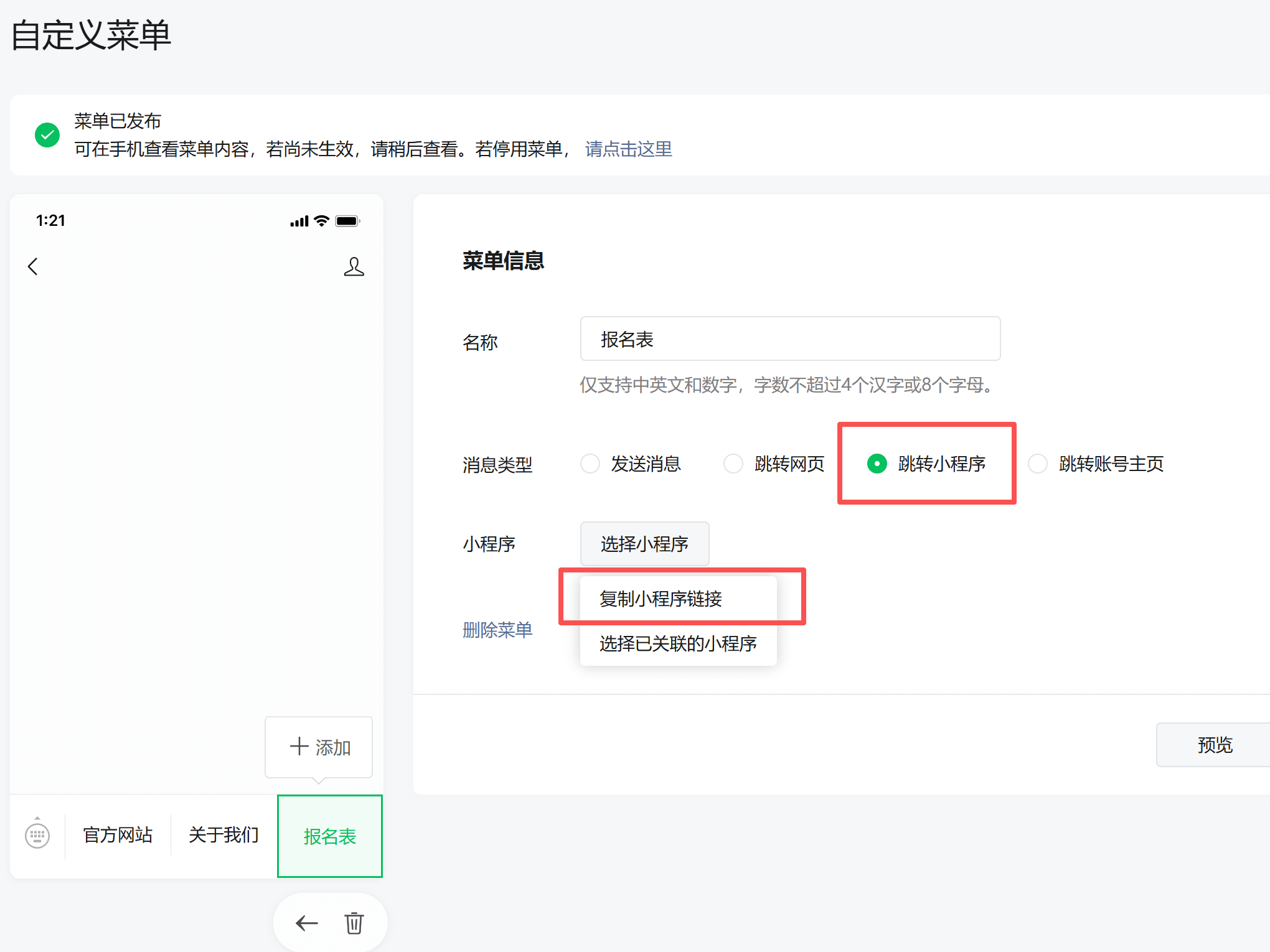 回到公众平台添加菜单,类型选择跳转小程序,然后选择复制小程序链接