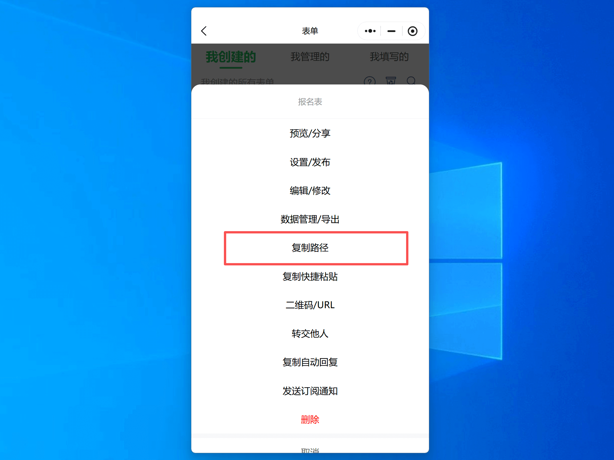 打开小正方助手,创建并发布表单/问卷,点击列表表单“复制路径”