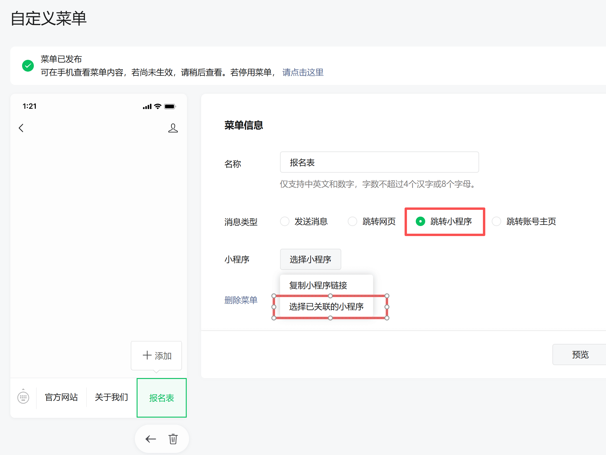 回到公众平台添加菜单,类型选择跳转小程序,然后选择已关联的小程序