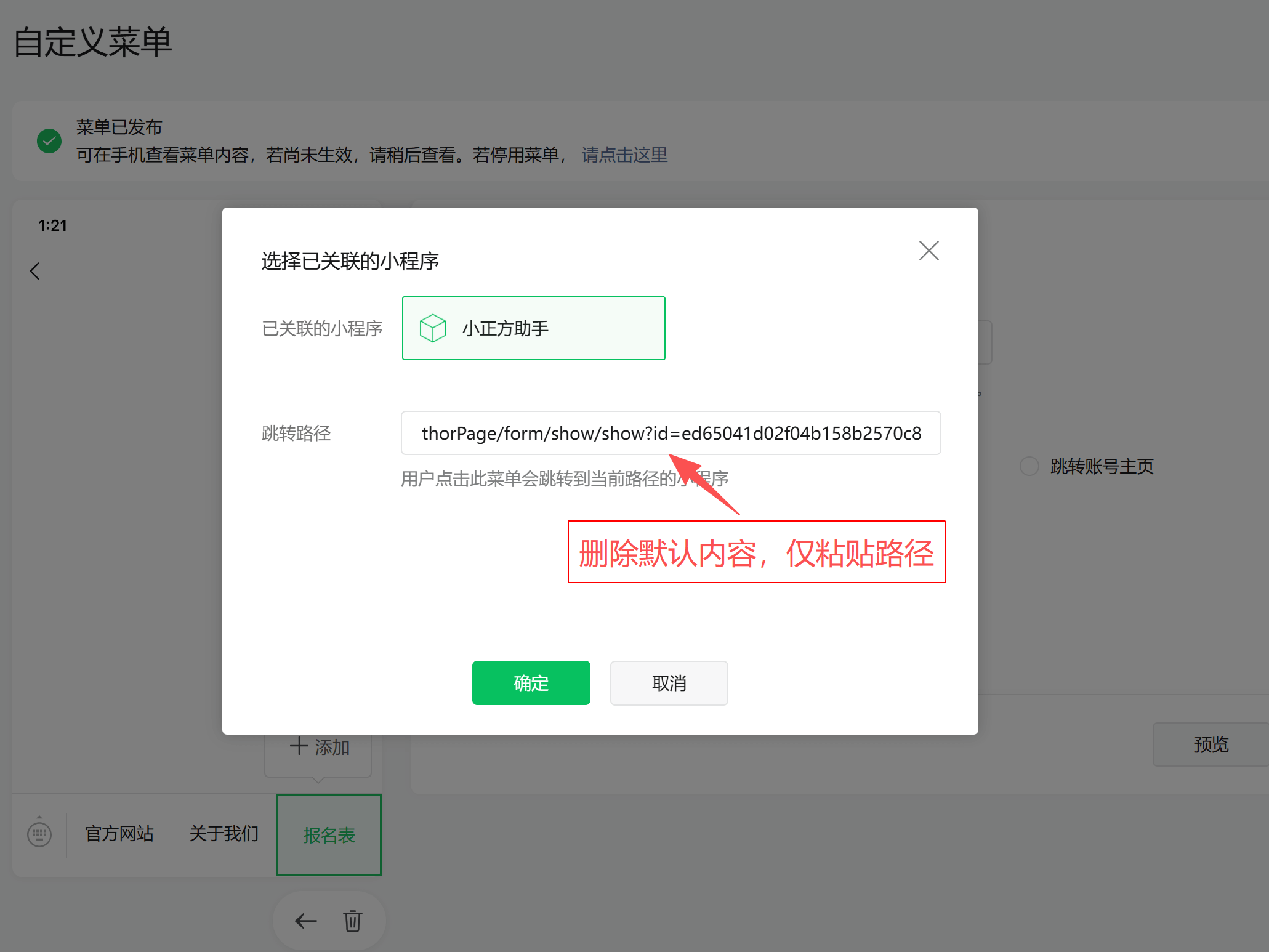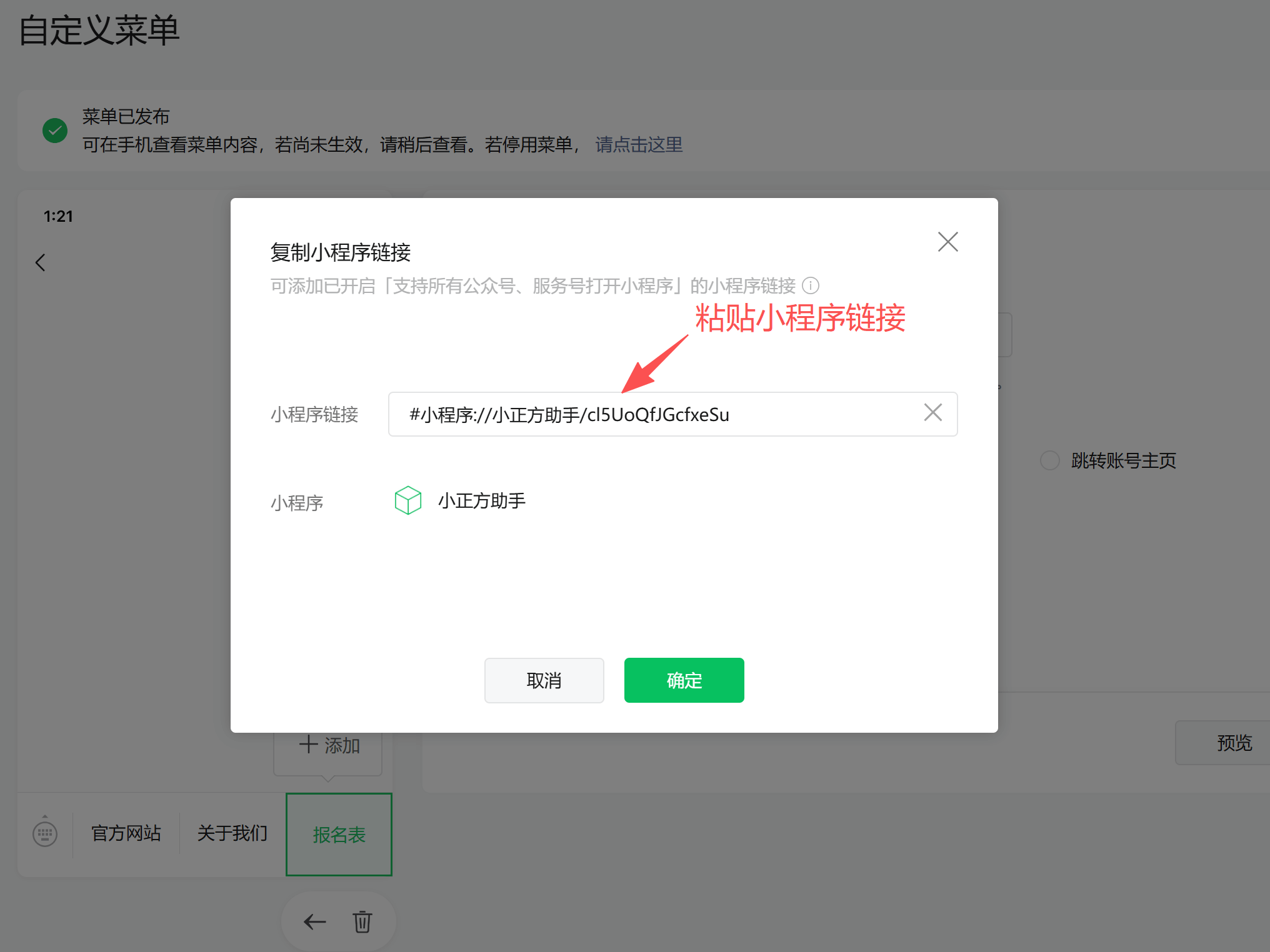 在弹出的对话框中,粘贴小程序链接,确定后预览无误,最后再发布菜单